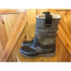 Spring Step women’s Peeta boots size EU 38 US 7.5-8 water resistant vegan leather pull on booty style fold over cuff decorative belt, round toe, inside zipper faux fur lining 10” length 14” calf