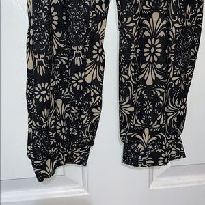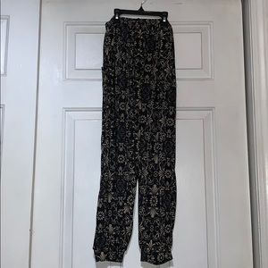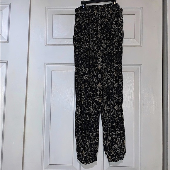 Thinner material. Has pockets. Size M-L. Capri length. Jogger style fit.