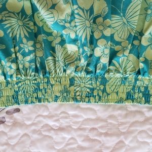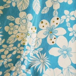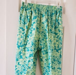 Lightweight and colorful relaxed fit capris in lime green and aqua blue. Size Small. Buttonfly with zipper and two pockets in front and elastic back waist. Small area of decorative lime green stones on lower front thigh area, as pictured. Very good condition.