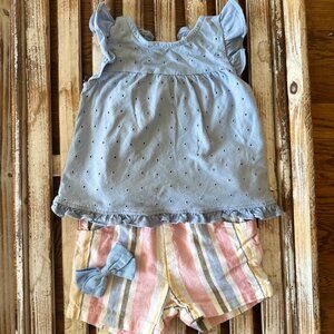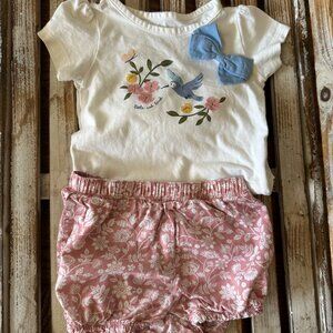 Mix and Match these adorable Carter's pieces. 2 pairs of cotton shorts, 3 coordinating tops, and a linen hair bow to complete the look.