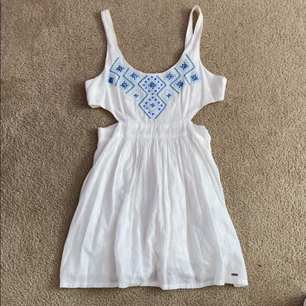 Never worn white with blue accent dress! My mom bought it for me and it’s a 7 but it was too big :/ It has side cut outs that are so cute 🤗 Might be a little dirty because it’s been in the back of my closet but so easy to wash !!!