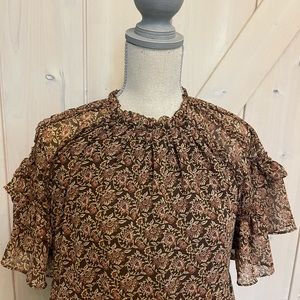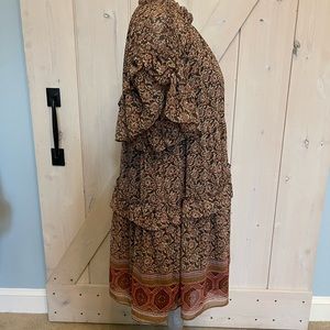 Baby doll dress fit. Gathered pleat neck and buttons in back. Cute flirty short sleeves, lined and 2 pockets on side. 100% polyester.
