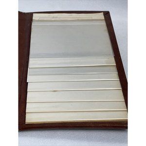 Each slot has a card stock insert but two are missing. The front top picture holder on the left hand side has a tear. The pages are stained and the spine has wrinkles. Overall in good vintage condition.