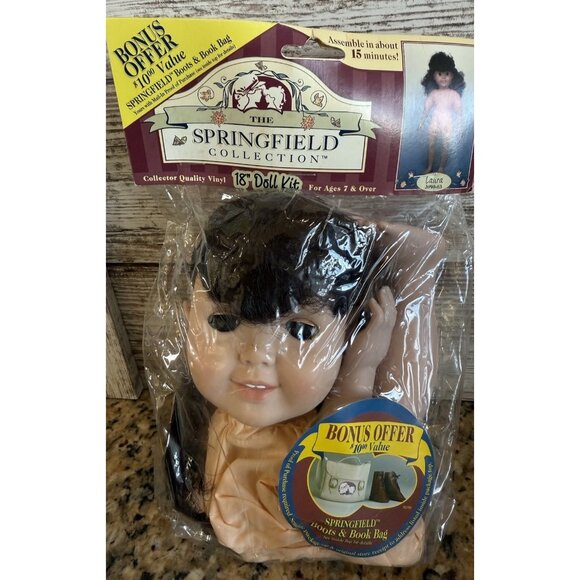 This is a Springfield Collection 18" Doll Kit from 1996. This doll’s name is Laura. The kit includes a soft body doll with straight hair, brown eyes that open and close, and a light complexion. The doll is vintage and original, compatible with other 18" dolls, and weighs 14oz. The kit is brand new and sealed, making it a great addition to any doll collection. This kit was purchased at an estate sale. It is new old stock. Thank you for viewing. (A160428252PM).