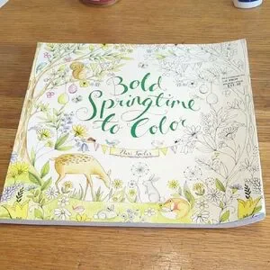 NWT. Double paged Bold Springtime to Color coloring book by Eleri Fowler. Super cute spring time images. On bottom right hand corner pages are slightly bent from standing up inside a tote. If placed under a heavy item they will straighten out. No creases in any of the pages.