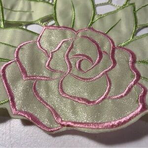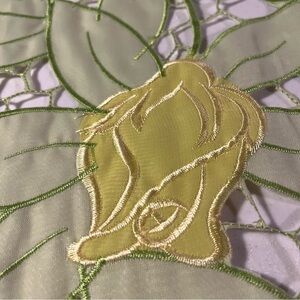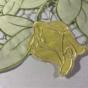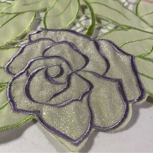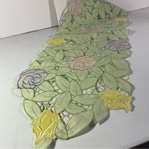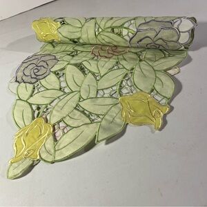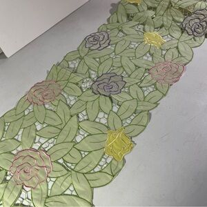 Elegant Springtime embroidered tabletop runner, 6 ft. X 13”, featuring embroidered floral design with a delicate open cut to remove excess fabric between flowers and leaves to emphasize the design. 100% polyester. Like new, rarely used if at all, in excellent condition.