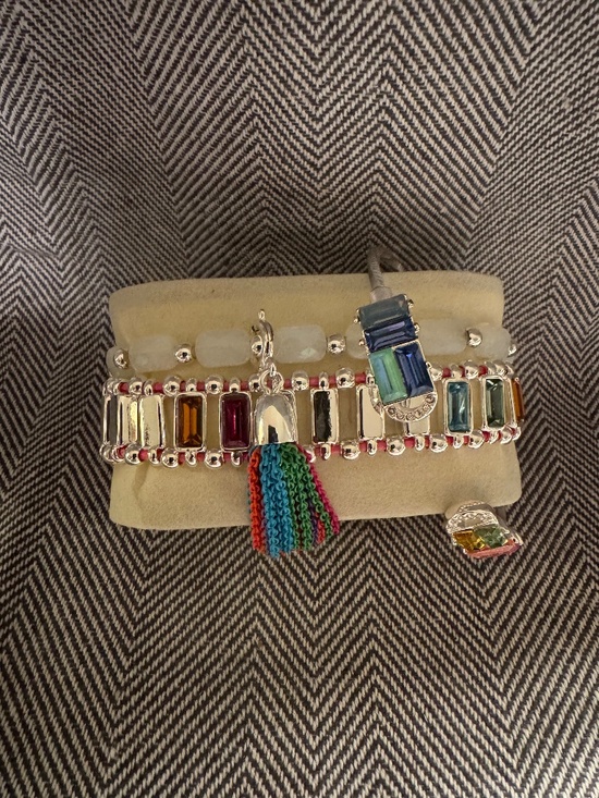 The Springtime Fiesta - Spring Stack by BP is a colorful and stylish bracelet made with lab-created multicolor stones set in silver plated metal. This cuff, wrap, charm, and tassel design adds a whimsical touch to any outfit, perfect for celebrating the arrival of spring. The BP brand ensures quality and craftsmanship, making this bracelet a fashionable accessory for the season.