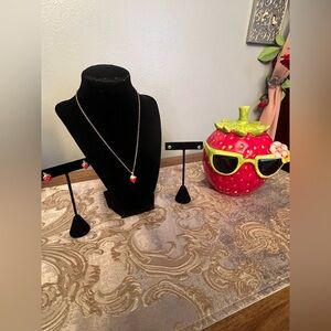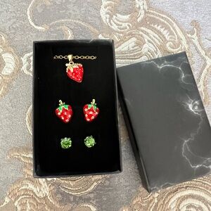 This gorgeous strawberry bundle set is brand new with tags! You get three pieces of jewelry and one strawberry decor for the price of one! You get a gold-toned strawberry necklace, a pair of strawberry earrings, and a pair of peridot earrings. Along with the cool-looking ceramic strawberry decor. These are all brand new and very springy.