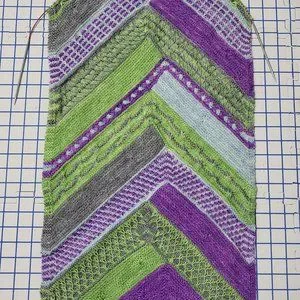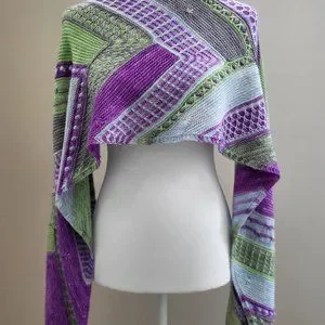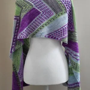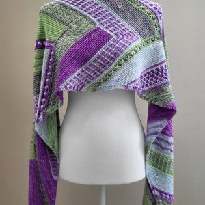 I used AT Haynes House Yarns, Haynesville Fingering, in C1 Kee Kee (purple), C2 The Good Ice (blue), C3 Gray Not Grey (gray), and C4 Liquid Mermaid (green). 1000% merino wool with lovely light drape and soft hand. Hand wash cool and lay flat to dry. Care instructions and lavender sachet included with purchase.