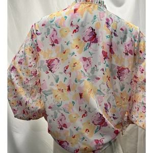 Springtime blouse just in time for bloom floral-inspired soft & feminine covered button front with jewel neckline small ruffle and tie. With full sleeves and gathered elastic wrist perfect with jeans or great for work. Ready to bring worn spring or summer. Brand New Never worn with no tags!