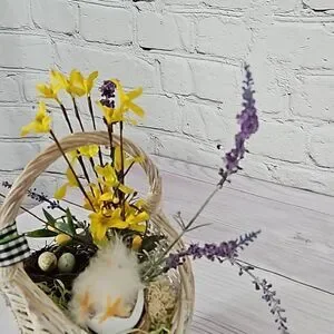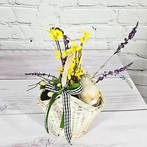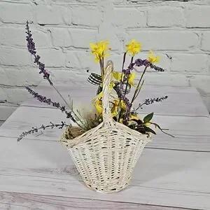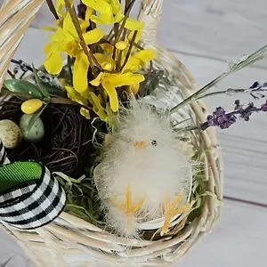 10" tall x 6.5" deep handmade arrangement. Faux nest with eggs, fuzzy chick in egg & nest, yellow forget me nots & lavender.
