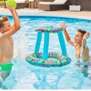 The Swimways Hydro Spring Hoops is a floating basketball game set for the swimming pool. The floating net opens for instant action and easily closes for storage thanks to an innerspring in the base of the basket. The fabric covering the goal features a brightly colored pattern that kids and teens love. This fabric cover also adds durability to the inflation chambers. Each basketball set includes an inflatable basketball with a textured grip for non-slip performance. Great for pool parties, endless summer days, and vacations. Folds flat and compact into three circles-Its's the perfect swimming pool game for travel. Includes one floating net and one ball per set. Carry/storage bag included. For children aged five years and above.