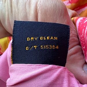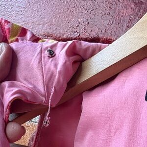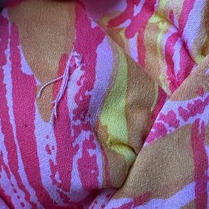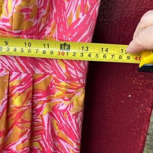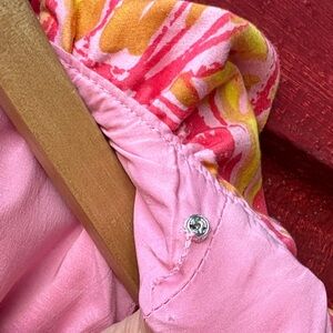 Vibrant tropical dress. Featuring a lively pink, coral, orange, and yellow pattern. Gives off serious Lilly Pulitzer vibes. I'm not sure what the little snap situation is around the neck but it's not intact. See pics.