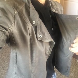 Brownish/gray jacket, great great condition. This looks great on jeans, shorts, any white(simple color) shirts under. With long Sleeves - that are skinny, follow the arm-not puffy. Great piece!