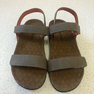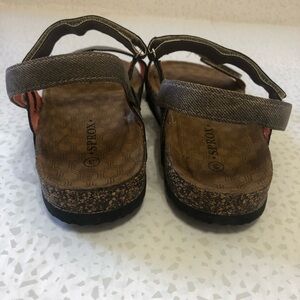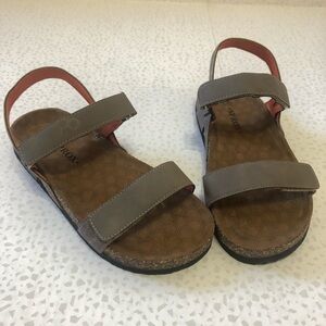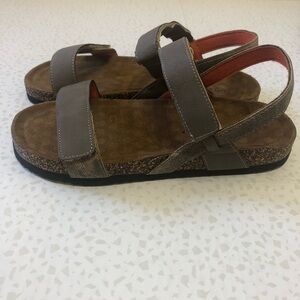 Sprox San Rafael Sandals. Kid's size 3. Open toe. Dual adjustable hook-and-loop vamp straps. Comfort padded footbed. Cork midsole. Textured foam grip sole. Taupe color.