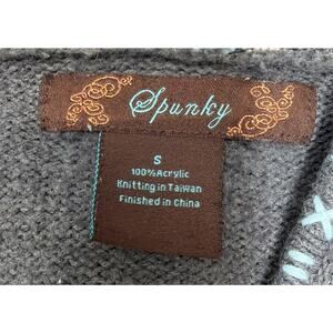 The Spunky Hooded Sweater is a vintage women's size small sweater with a unique crayon pattern. Made of acrylic knit fabric, this pullover sweater features long sleeves, a hood, and a vibrant multicolor design. Perfect for those looking for a 90s style sweater with a fun and playful look. The Spunky brand adds a touch of nostalgia to this wardrobe essential.