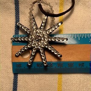 Rhinestone embellished spur rowel on a leather cord with lobster clasp. Good condition.