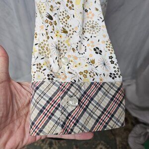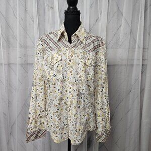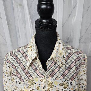 Spy Henry Lau Yellow Blue Floral Plaid Western Button Down Blouse Size L