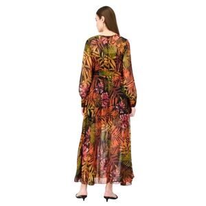 SIZE MEDIUM - This SPY ZONE EXCHANGE Feather Leaf Print Maxi Wrap Dress is beautiful and perfect for any occasion.• Size: M• Multicolor • Feather / Leaf print • Long sleeves• Made in United States • Deep V • Double Button Cuffs • Tie Waist • Maxi • 100% Polyester, partially lined, APPROXIMATE MEASUREMENTS - Chest across is about 19" and the length is about 53"