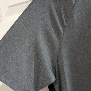 This Spyder men's short sleeve athletic top in size small features a modern color block design in black and charcoal gray with striking red accents. It has a crew neck, a unique zip pocket detail on the bottom left, and a form-fitting cut made from a breathable, lightweight, quick-dry blend of 91% polyester and 9% spandex. Pre-owned and in excellent condition, it measures approximately 18" from armpit to armpit, 27.5" from the center back of the neck to the hem, and 4" from the armpit to the sleeve cuff.