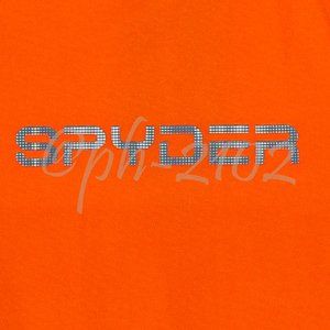 Orange tee with Spyder text logo on chest paired with gray swim shorts with red Sypder logo