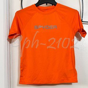 Orange tee with Spyder text logo on chest paired with gray swim shorts with red Sypder logo