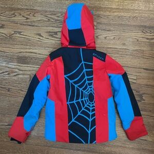 Vibrant Spyder jacket with bold colors. Ideal for outdoor adventures. Removable hood. Zipper pocket with goggle cleaning cloth in left sleeve. Small faint stains in a few spots - shown in last 2 photos