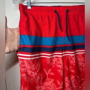 Drawstring waist, pockets, logo, red and blue striped with tropical palm floral Hawaiian print. Lined. Has a few spots (see photo with measuring tape). Not very noticeable. Selling as is.
