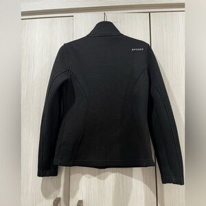 Technical Spyder mid layer ski jacket in black. Designed in ribbed stretch material with a full zip front, two hand pockets, and subtle branding — Spyder logo on the bicep and “Spyder” lettering at the back shoulder. Women’s size Small. Preowned condition with small holes inside the pocket lining and some light stains (see photos), which may come out with washing. Still a functional and warm layering piece for skiing, snowboarding, or cold-weather wear.
