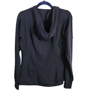 Spyder Full Zip Soft Shell Black Hooded Jacket Size L. Pit to pit 22", shoulder to hem 25", Quality, Zip Pockets, Thumb Holes, Mock Neck, Fitted Style, Retail $149. Good Pre-Owned Condition