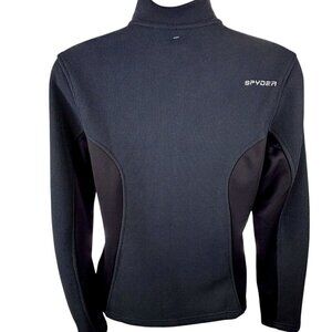 Awesome, Spyder soft shell jacket.Knit jacquard brushed micro denier tricot inner collar l, active fit, princess seams for a feminine silhouette. Reverse coil center front zipper, zippered handwarmer pockets inset into princess seams. Navy(Frontier) & black. This jacket was used in a photo shoot. The label on the neckline was removed.