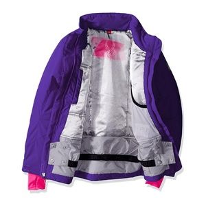 HAS A REMOVABLE HOOD WITH INNER GAITER, HAND AND CHEST POCKET ZIPPERS, ADJUSTABLE CUFFS AND INTERIOR SLEEVE WITH THUMB HOLES, ELASTICIZED SIDE PANELS AT THE WAIST, AND THE INDUSTRY STANDARD IN WATERPROOFING AND INSULATION. COLOR PURPLE.