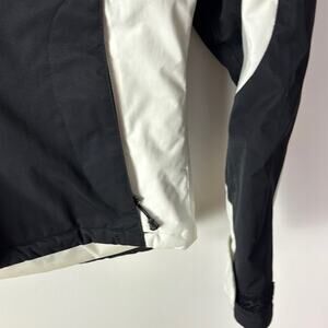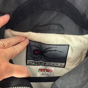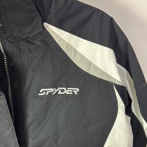 Gently Used Spyder Axys Full Zip Jacket. This is a women's 8. Mostly black with white accents. Spyder text logo on the chest. Front zipper pockets. Perfect for ski / snowboard. Zip off hoodie that is not included.