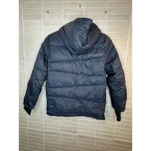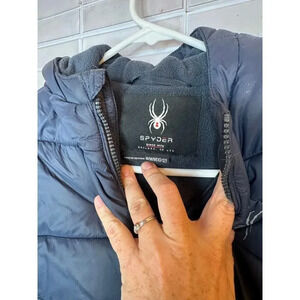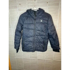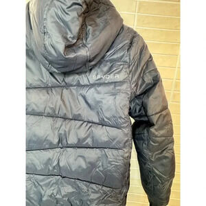 This Spyder down jacket combines warmth with unique style, perfect for keeping kids cozy during cold weather. Designed in classic black, it features a distinctive geometric pattern created by uneven horizontal stitching, adding a modern twist to its look.