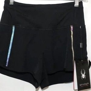 Spyder Active Double Running Athletic Tennis Shorts Black Womens S Spyder Active Double Running Athletic Tennis Shorts Black perforated outer sides size large New With Tags 92% polyester, 8% spandex Women's athletic wear shorts Spyder Black with reflective accents Zippered pocket at back of waist.Built in second short brief Inside drawstring High waisted. Moisture Wicking upper waist back pocket measurement are approximately in inches waist 16”Length 12.5” inseam 3”