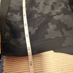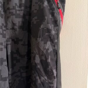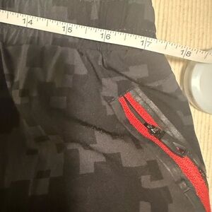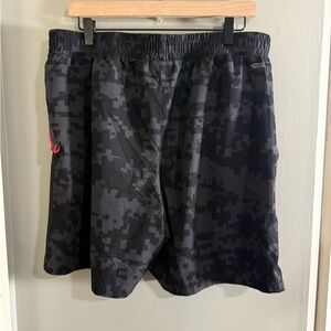 Stylish athletic shorts with a digital camo pattern. Features red zippered pockets. Elastic waistband for comfort.