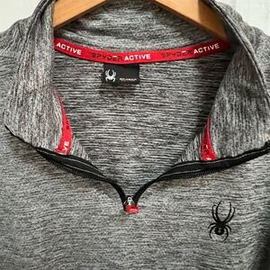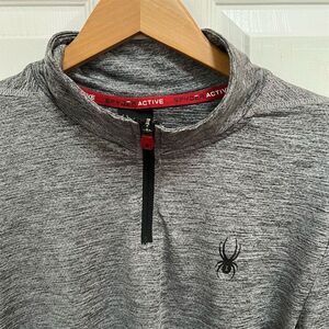 Keywords: Spider pullover, men's activewear, moisture-wicking, four-way stretch, gray pullover, long sleeve, zip closure, mock neck, fall fashion, size large, machine washable, polyester, elastane, solid pattern, pre-owned.