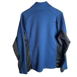 Spyder Men's Half Zip Sweater Gait Knit Pullover Jacket in Blue. Missing size tag -- fitst like a Large / L. Features stand collar, raglan long sleeves, half zip closure, chest zipper pocket, and black stretch panels. 100% Polyester. Excellent pre-owned condition.