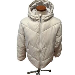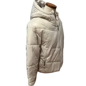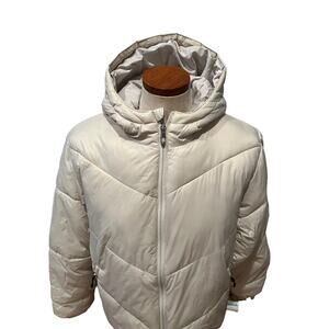 New Spyder MoonBeam Cream Puffer Hooded Jacket, size M. Nylon with poly fill, hooded, zippered front and Two zip pockets