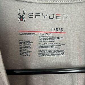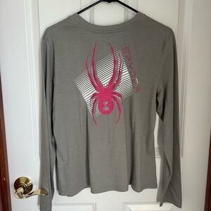 Gray shirt with a bold pink Spyder logo. Ideal for everyday wear or layering