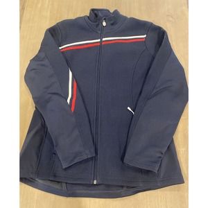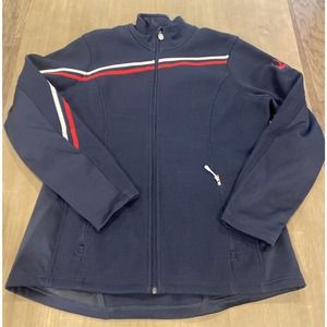 Stylish Spyder ski jacket. Navy with red and white stripes. Full zip closure. Ideal for winter sports.