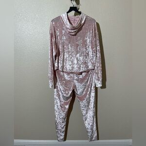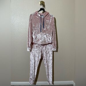 Stylish pink velvet hoodie and jogger set. Perfect for a cozy and chic look.