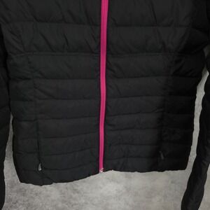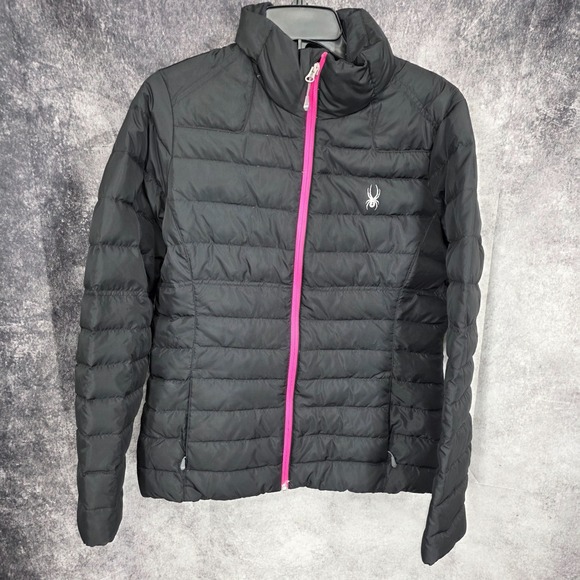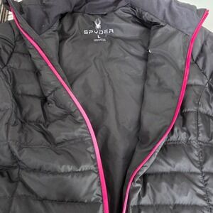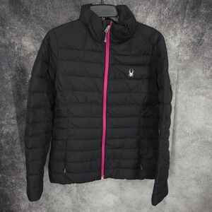 Spyder Prymo Puffer Down Jacket Womens Large Black Pink Coat Winter Ski Snow