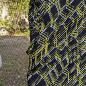Black with green white and gray pattern. The suspenders are removable. The label says the hem can be lengthened.