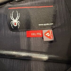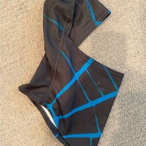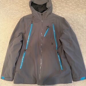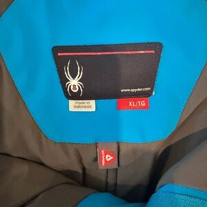 Blue snow bibs (size: XL), gray/blue insulated jacket (size XXL), beanie, balaclava, and gloves.