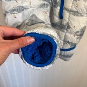 Super cozy infant snowsuit with a mountain skiing pattern. Has fold over arms and feet.