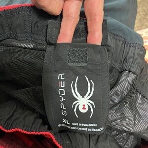 Spyder Swim Trunks Boardshorts Men's XL Red Black & Gray with Mesh Lining Pockets Inseam 8.5, inside key pocket, one hook and loop back pockets with key loop, very good condition, woven fabric with stretch, 92 poly, spandex