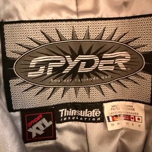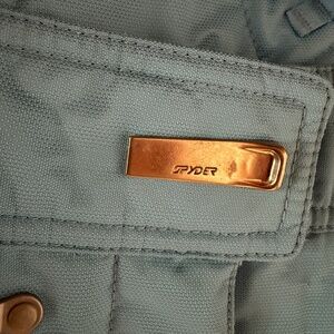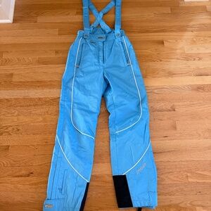Spyder Thinsulate Snow Ski Snowboard Pants Suspender Overalls Womens Size 8 Blue. Light Blue, insulated snow pants with removable and/or adjustable suspenders. Zipper pocket on each hip. Elastic on each side, with snap adjustment (pics 9 and 10.) Snap and zipper at both ankles. 4.5" zipper pocket on front of right leg for storage. Size 8 Women's. Excellent, clean condition with no holes, tears or stains. Look new.