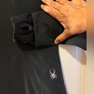 Sleek, technical Spyder jacket from the aughts. Lots of details, pockets and zippers. Features like thumb holes, air vents, and magnetic closure covering the zipper. Signature Spyder branding on zipper pulls.