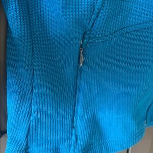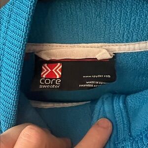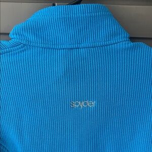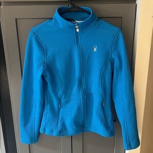 Spyder Women's Endure Full Zip Jacket in a vibrant blue. This athletic full-zip fleece features a high neck, ribbed texture, and the iconic Spyder logo on the chest. Perfect for outdoor activities, layering, or casual wear, offering warmth and comfort. It includes two zippered hand pockets for secure storage. Excellent pre-owned condition, with no visible flaws.